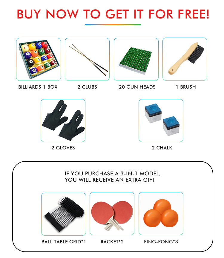 | Including accessories | MDF medium density board 2 golf clubs A box of billiards 2 pieces of chocolate powder 2 gloves 20 spare gun heads 1 knife brush A pair of table tennis rackets 6 ping pong balls A set of table tennis table frame |
