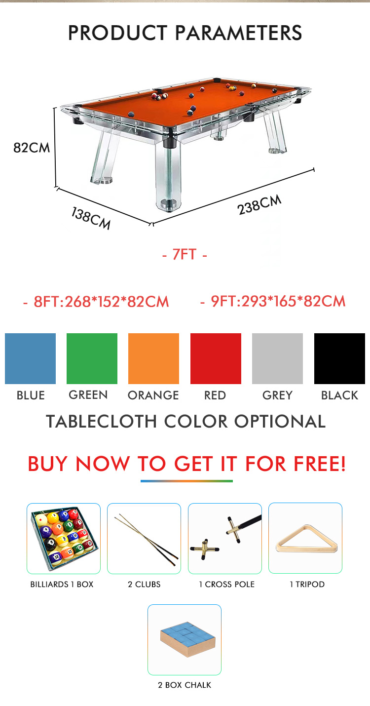 S.Q.F 8FT Deluxe Custom Crystal Glass Pool Table Standard American 8 Feet for Snooker for Ball Room KTV Room Club House